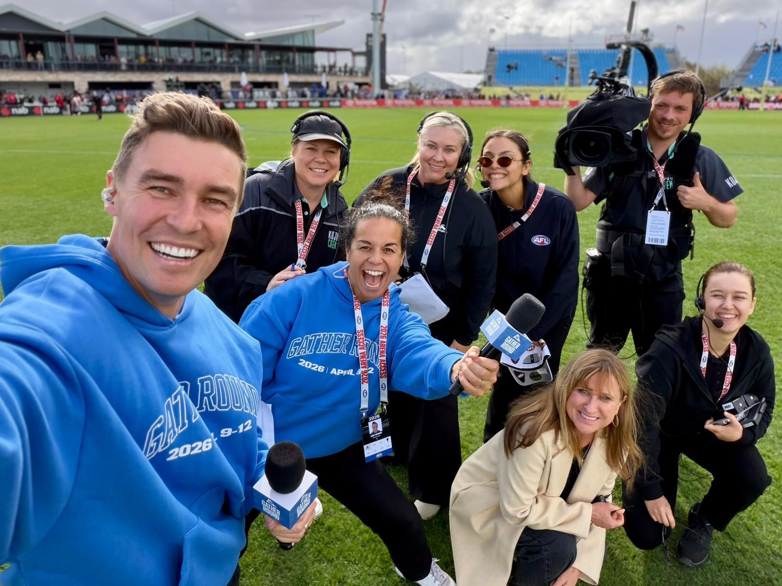 It’s 9 degrees with an apparent temperature of 2.9. Gloomy clouds are menacing over Nuriootpa. When I was a kid, this was always the way. Last year Gather Round witnessed cricket weather. I’ve missed the footy’s start but large screens —are these Jumbotrons? — show the Fox telecast. On the wing, an opportunity for face-painting. I resist.