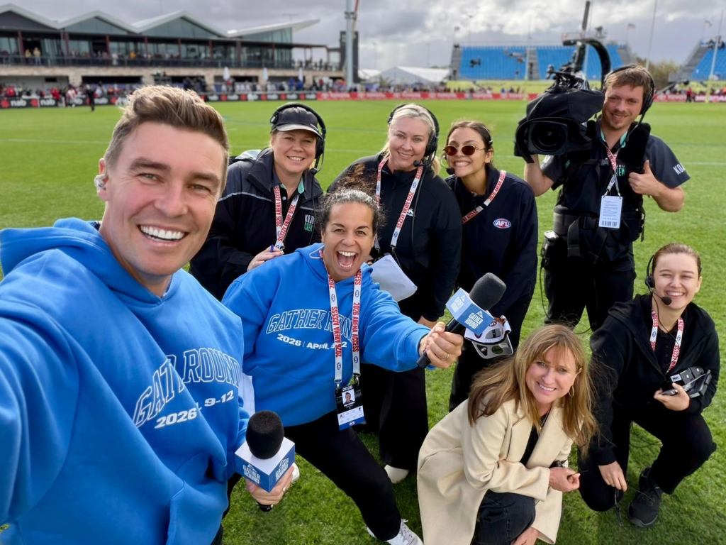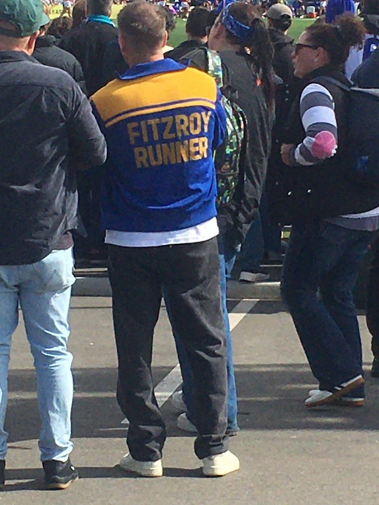 Beyond Kangaroo blue and white and Brisbane Lions jumpers and scarves, the bouncing throng is flecked with Freo colours and Carlton kit, Hawks beanies, and the clashing colours of the Crows and Power. Gather Round might be the truest meeting of all the tribes. A bloke on the concourse sports a retro tracksuit with Fitzroy Runner on the back. It could only be improved if he were in Ciak shoes and dragging on an Ardath.