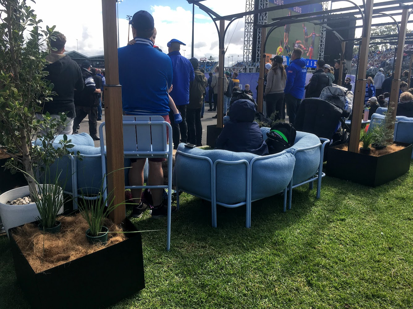 Inside, the crowd throbs about the fence. The scaffolded stands have empty seats. Brisbane gets a goal although I can’t see who. I know neither the goal celebration song grab, nor the player for whom this is an aural tattoo.