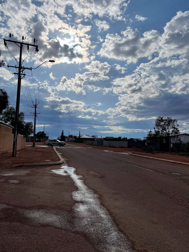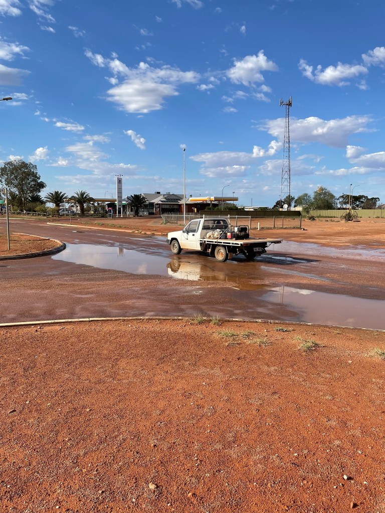 Lurching along by the kangaroo orphanage, the rain beats a pulsing tattoo on the tin roofs. Puddles and mud now smear the good earth. The desert isn’t as thirsty as I would’ve thought and like a surly child the ground almost seems to refuse the water.