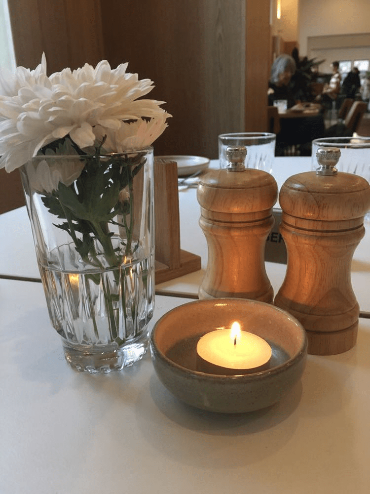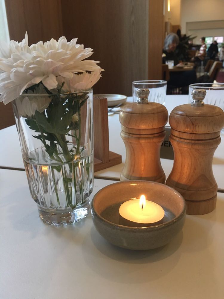 Mine host lent over and set the candle aflame. A small vase of fresh flowers smiled up at us from the table too.