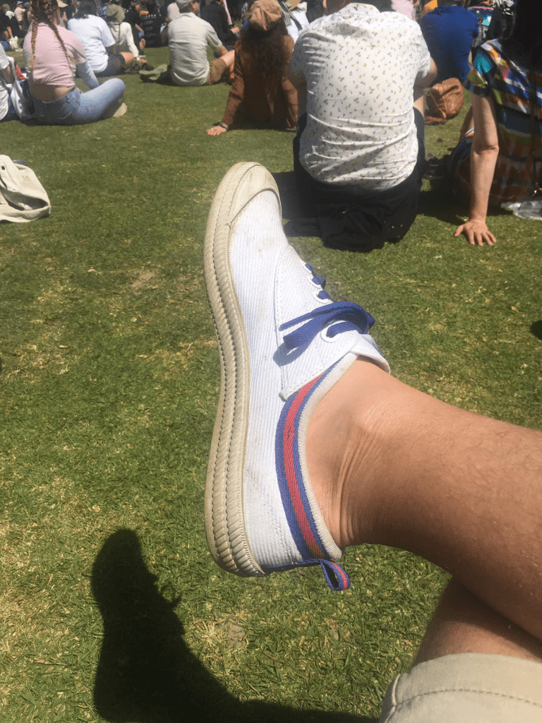 I’m up the back of the Harvest Stage. I peer up. Encircling us like ancient guardians, gum trees stretch and wave while above is the cityscape, newly impressive now, and emblematic of Adelaide finally being softly buoyant and sure of itself. Between sets, ‘Ego is Not a Dirty Word’ by Skyhooks surges over the blue sky, continuing the day’s uplifting nostalgia. It’s a Sunday BBQ song and my immersion into the world of the festival has arrived.