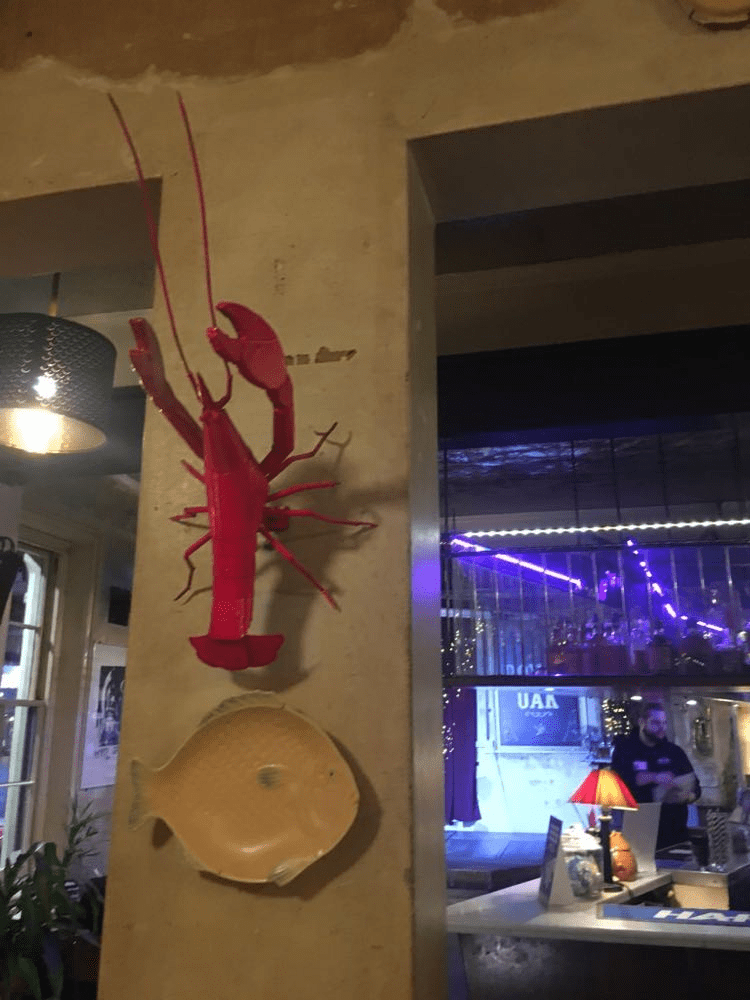 Inside, it’s the aesthetic inverse of all those cavernous and charisma-free supermarket pubs. The interior functions as a contemporary art gallery, and we could be in one of MONA’s G-rated colonnades (there aren’t many). In the dining room various constructed lobster hang off the walls, in an intriguing tangling of text and context. Their meaning is that they are devoid of any meaning, but this renders them intriguing.