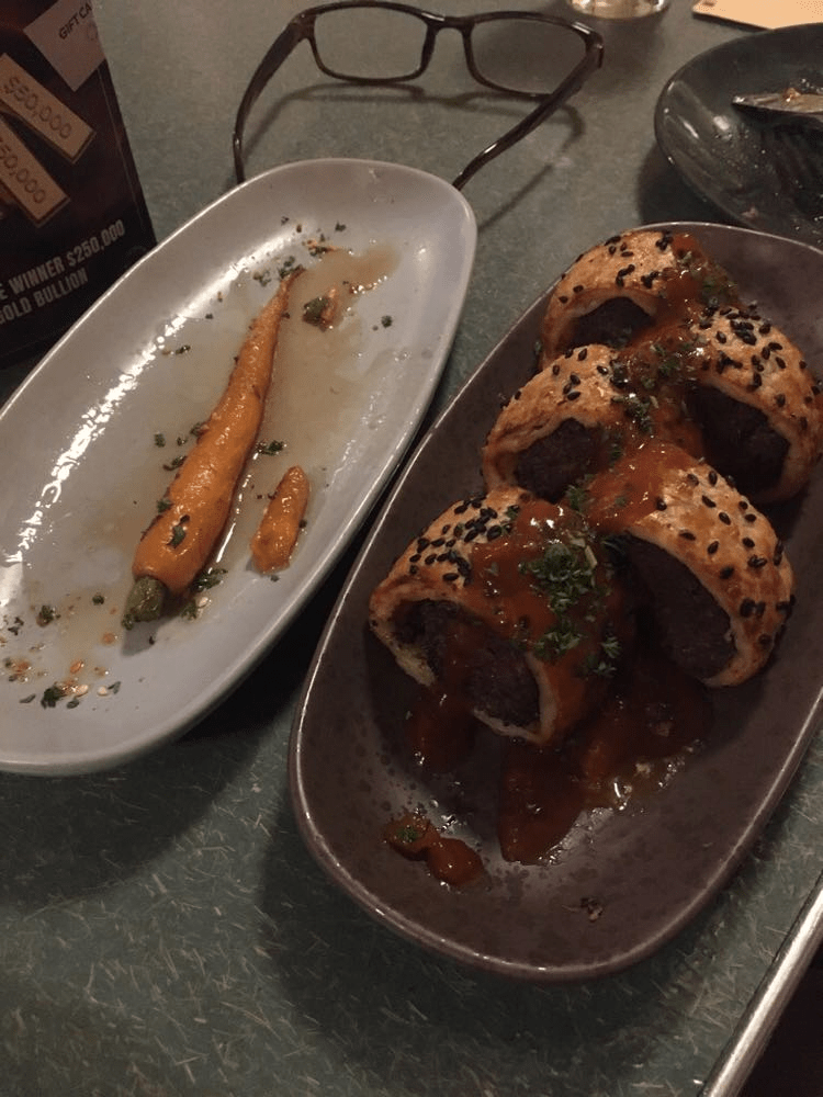 The Royal Oak on North Adelaide’s O’Connell Street does a tidy line in share plates. Enhancing the mandatory mystery but forsaking chips, Claire clandestinely ordered a serve of honey-roasted carrots and lamb sausage rolls. Both were minor key triumphs although about the carrots there was a faint suggestion of hot carnival doughnuts. Chips were now dead.