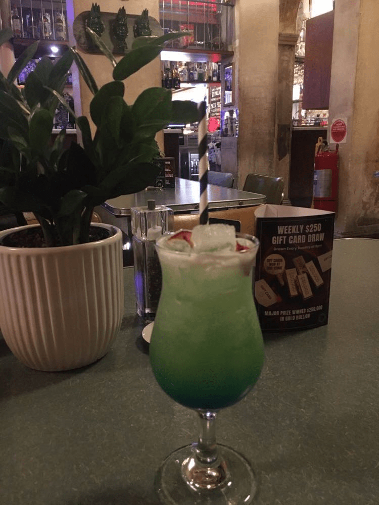 Our second and concluding drink comes courtesy of table service (in a pub, I know!) with a green cocktail named for the Mississippi (it’s New Orleans night in here) for Claire, and a Pale Ale for me. I’ve eschewed the craft beer offerings for the metronomic safety of a Coopers. But then for my wife, the cocktail aficionado’s dilemma: drink as is and preserve the pretty appearance or stir and ruin the visual art but agitate the beverage to achieve its intended palate?