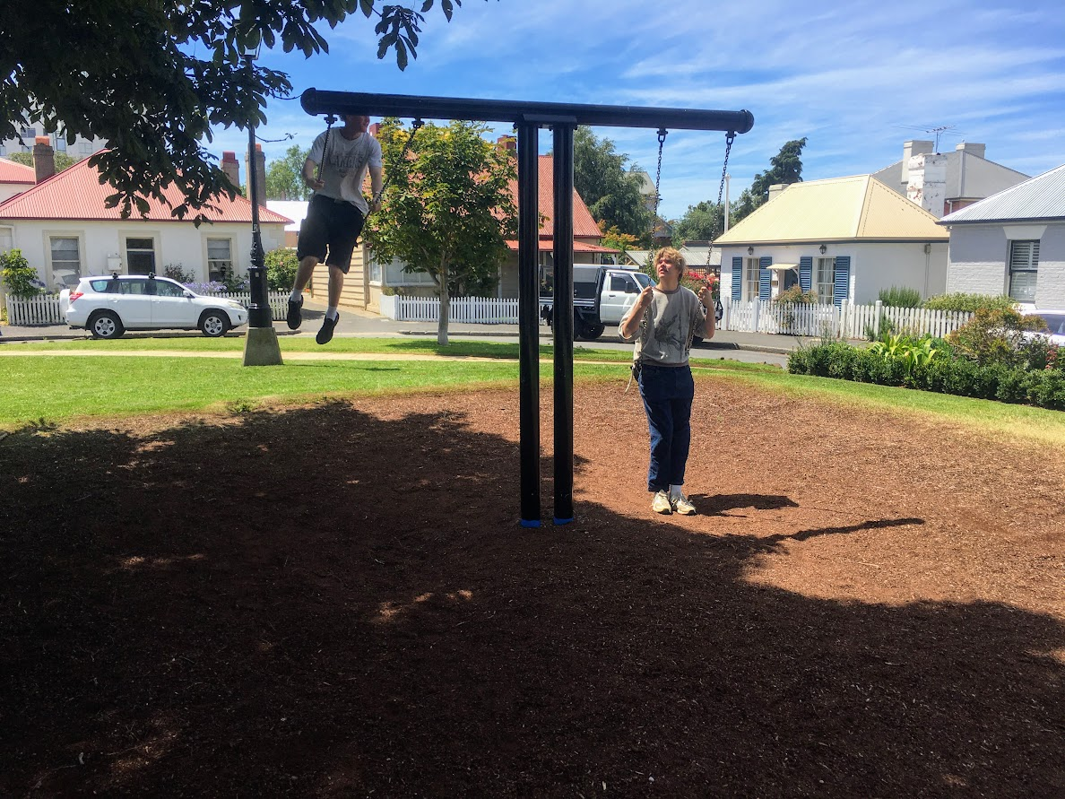 Pausing in Arthur Circus, you both jumped on the swings and suddenly, it was a decade ago in any of a dozen playgrounds. For the final time in Hobart, we’d another vertical moment.