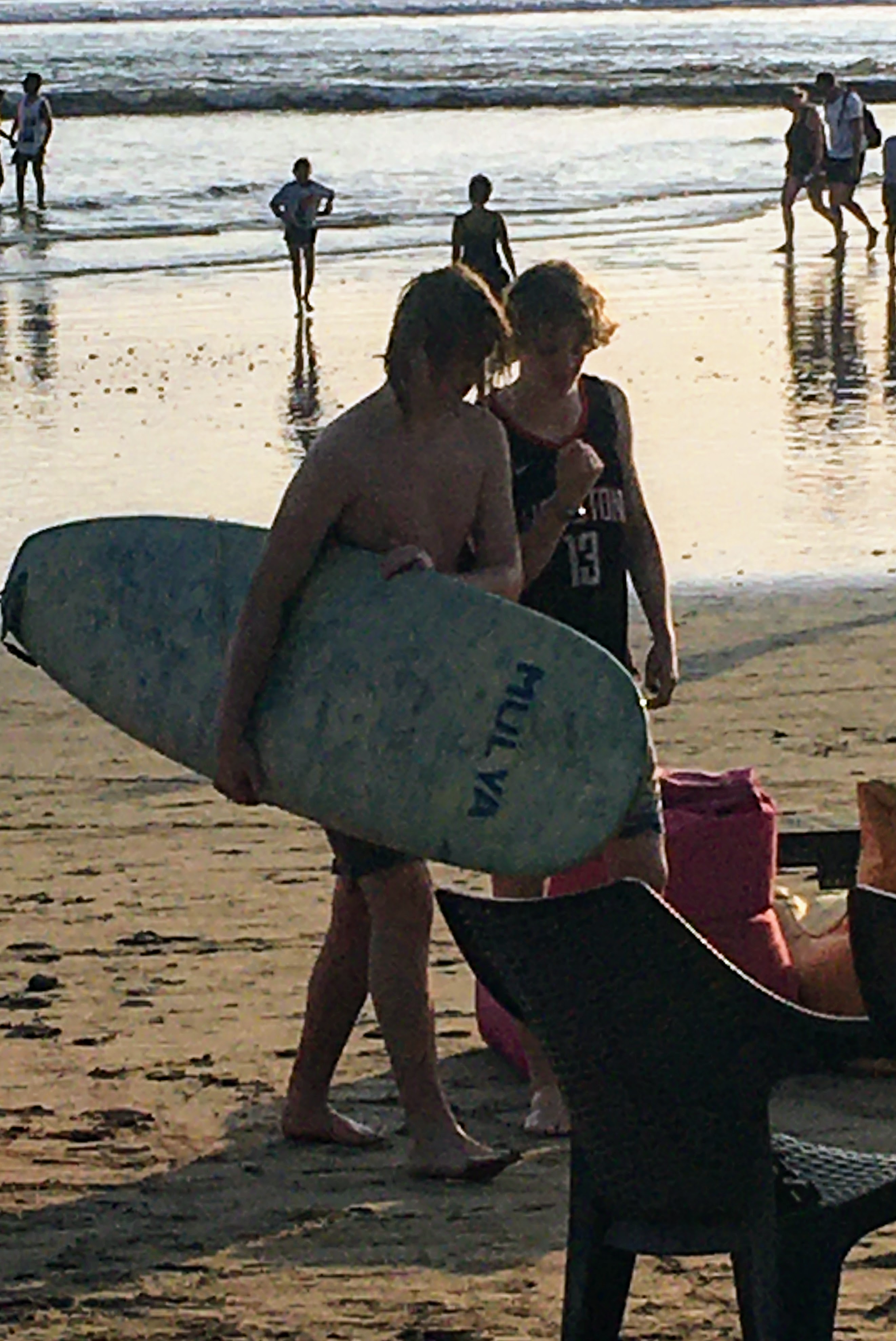 I loved late afternoons on Kuta Beach when after a day of investigation, we’d sit on beanbags at the Fiki Fiki Bar. Young coconuts for you two and a (rare) beer for me. We’d discuss ways to manage the ceaseless stream of people selling things. How about Max’s pedicure? Big toes only (budget restraints). Alex hired a board and went surfing. These were entertaining moments in which the wider world was embraced by you both.