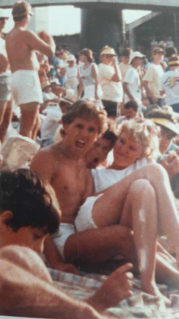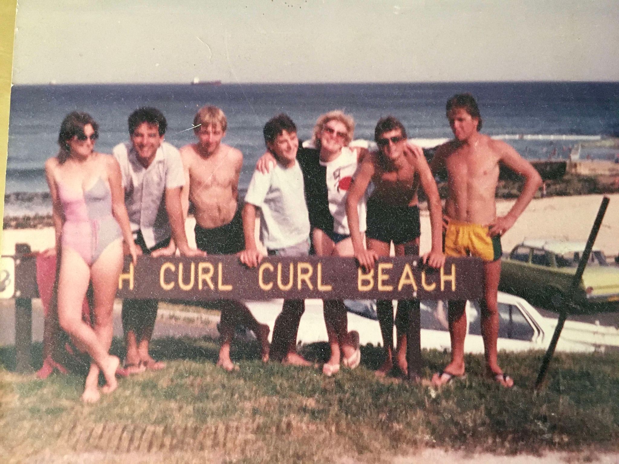 We didn’t even swim at Curl Curl — something about the waves didn’t look overly inviting and we carried fresh scars from Bondi — but did pose for a photo by the modest brown sign. Chrisso snapped it, and while Paul and Brendan lingered to the side, it captured us at that exact instant: young and fresh-faced and with our categorically eighties hair.
