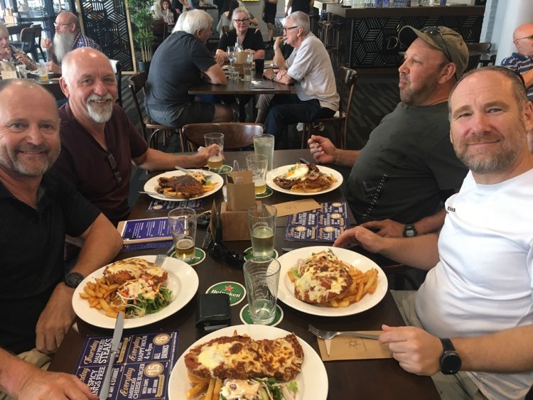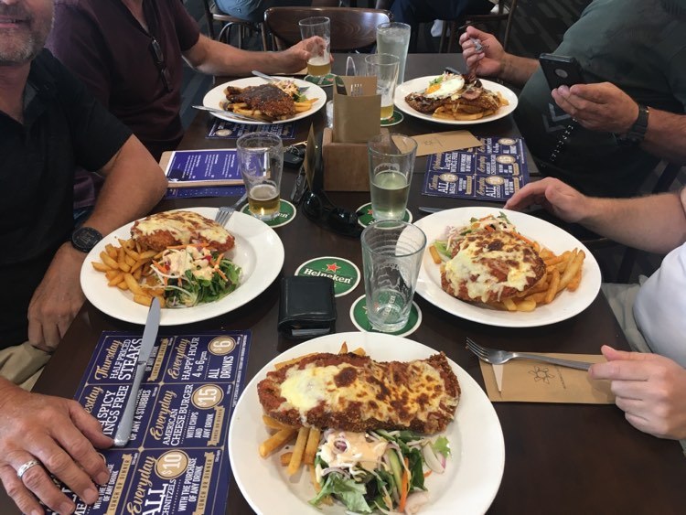 Three portly chaps have dropped anchor at the bar and appear as if they might be moored in the marina against an approaching storm. The bar does seem to attract folks from neighbouring homes. They could be here for the BBQ that’s soon to a-sizzle on the footpath or maybe there’ll be karaoke later. It’s a busy, ambitious place. I wonder if they have Macrame Mondays or if I’ve missed Sonnet- Writing September. Minimalism isn’t part of the strategic plan here.